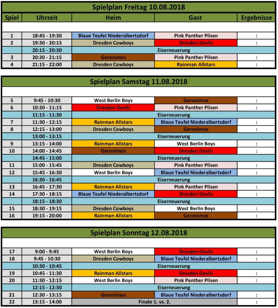Der Spielplan ist offiziell! Demnach eröffnen das Turnier am Freitag um 18:45 Uhr die Blauen Teufel aus Niederalbertsdorf gegen die Pink Panther Pilsen. Enden wird das Turnier am Sonntagnachmittag. Kommt vorbei, der Eintritt ist frei. Beim Ostraspaziergang kann man auch mal reinschneien und sich zwischenzeitlich ein Bier in bester Atmosphäre gönnen :-)